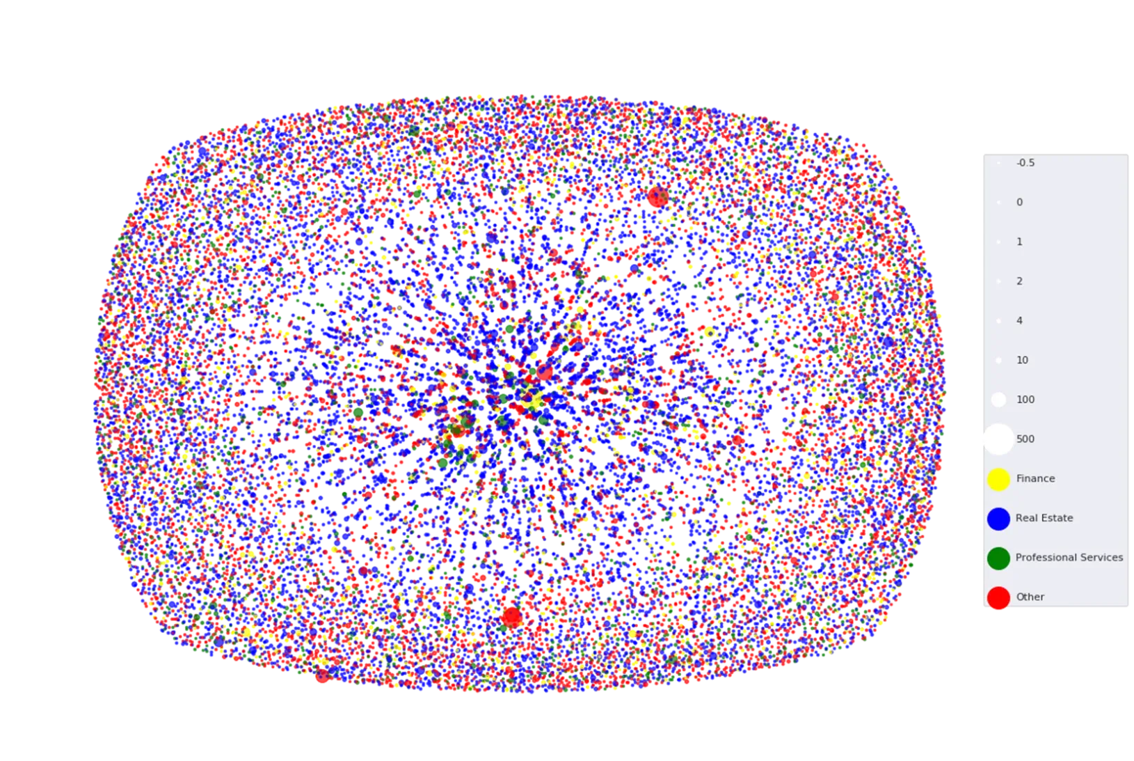 This figure presents 10,000 partnership-related businesses studied by Lester and her colleagues. A dot’s size indicates the complexity of the partnership; its industry is represented by color. Partnerships closer to the center of the figure are owned by taxpayers who own more additional partnerships. | Courtesy