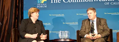 Christina Romer (left) and Keith Hennessey (right). (Photo courtesy of the Commonwealth Club)