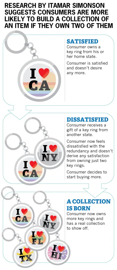 | by Louise LeeEveryone knows someone who collects things — whether it’s refrigerator magnets or political bumper stickers. But what marks the turning point at which someone goes from owning items to building a collection of them? Research by Itamar Simonson found that it all starts with two: People are more likely to build a collection of something once they possess two of them.