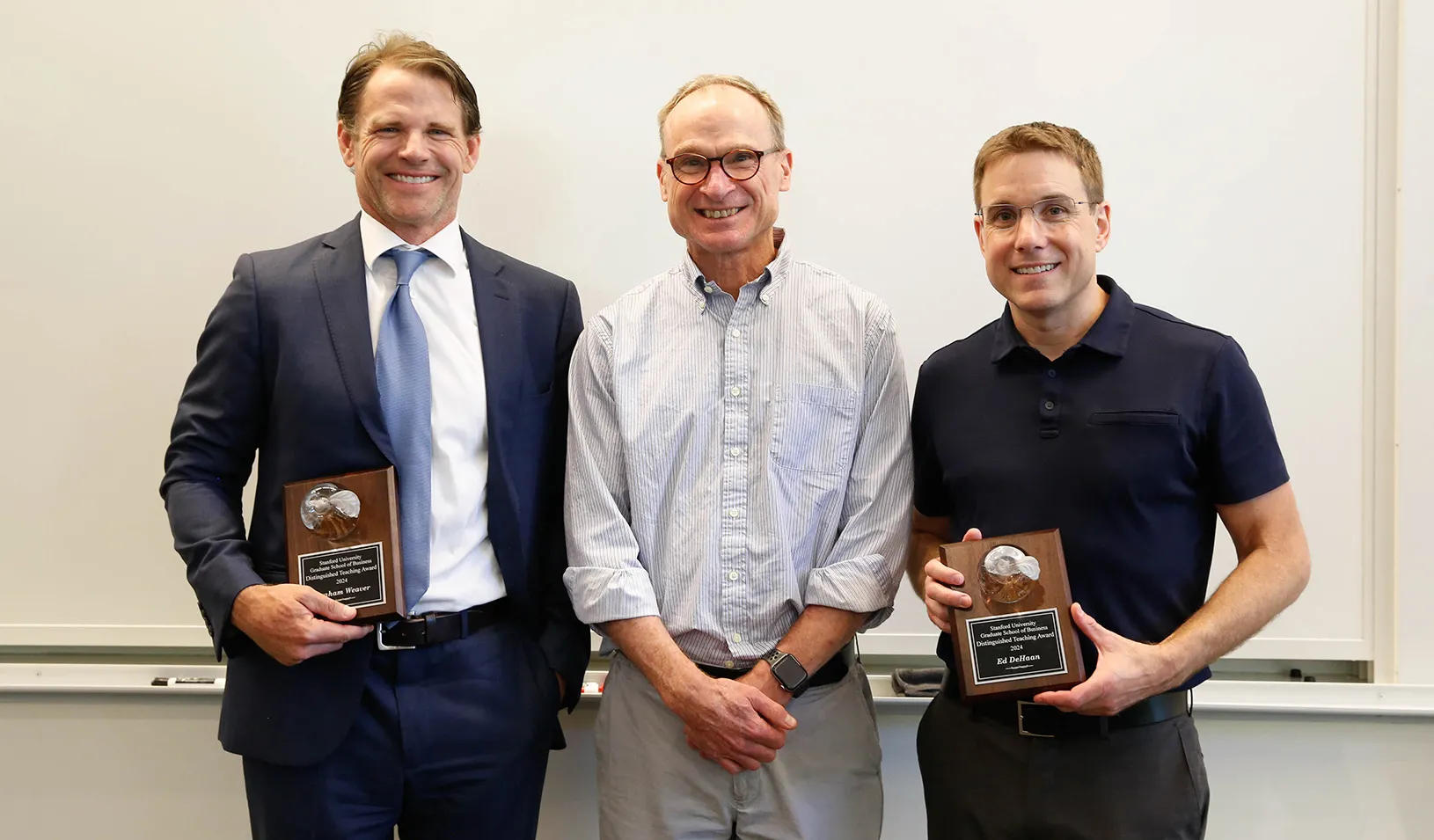 For the first time, the MBA Academic Committee presented Distinguished Teaching Awards to two faculty members, one for a course in the core curriculum and another for an elective. Professor of accounting Ed deHaan was recognized for the quality of his teaching of the core Financial Accounting course, and lecturer Graham Weaver won for his work in Managing Growth Enterprises.