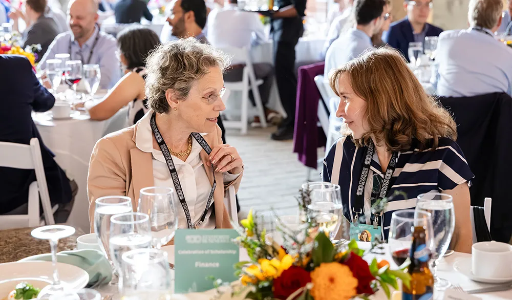 Professor Anat Admati (left) at the Faculty Celebration of Scholarship | SF Photo