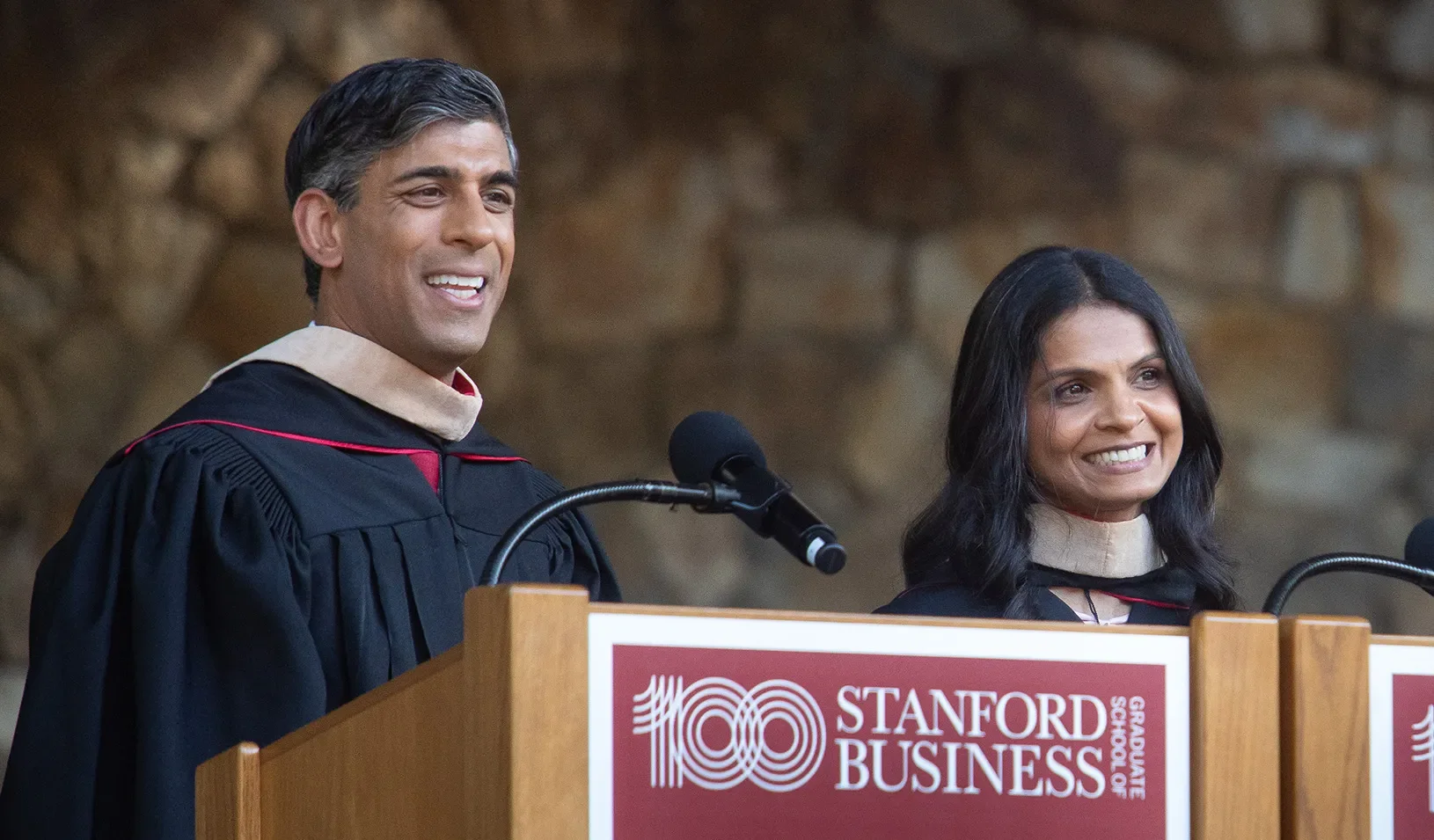 | by GSB StaffAs the late-afternoon sun shone on Frost Amphitheater on June 14, the commencement ceremony for Stanford Graduate School of Business featured an address by Akshata Murty, MBA ’06, investor and philanthropist, and Rishi Sunak, MBA ’06, Member of Parliament and former prime minister of the United Kingdom.
